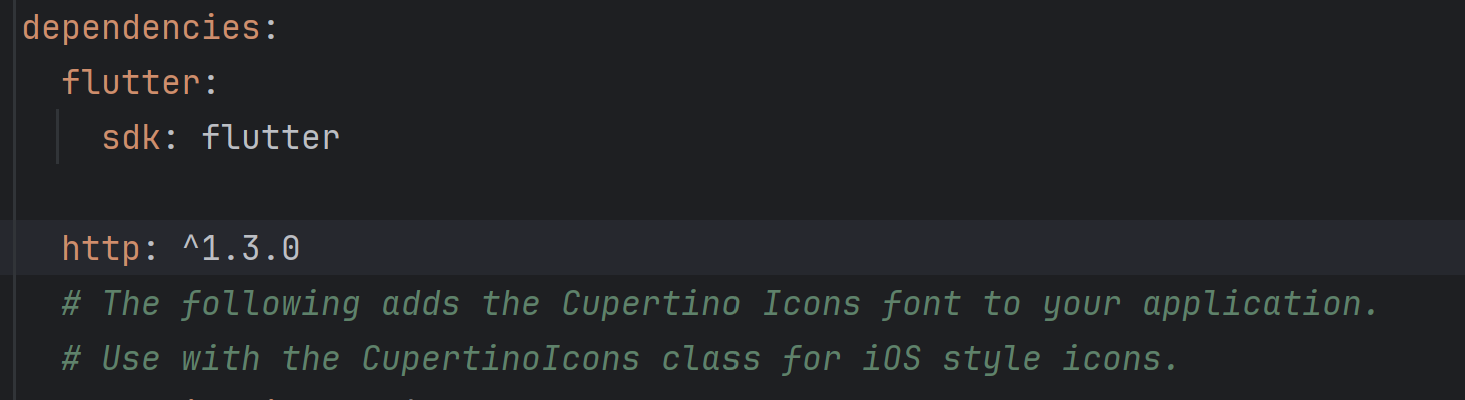 pubspec.yaml 파일로 가서 dependency에 http 패키지를 명시해준다